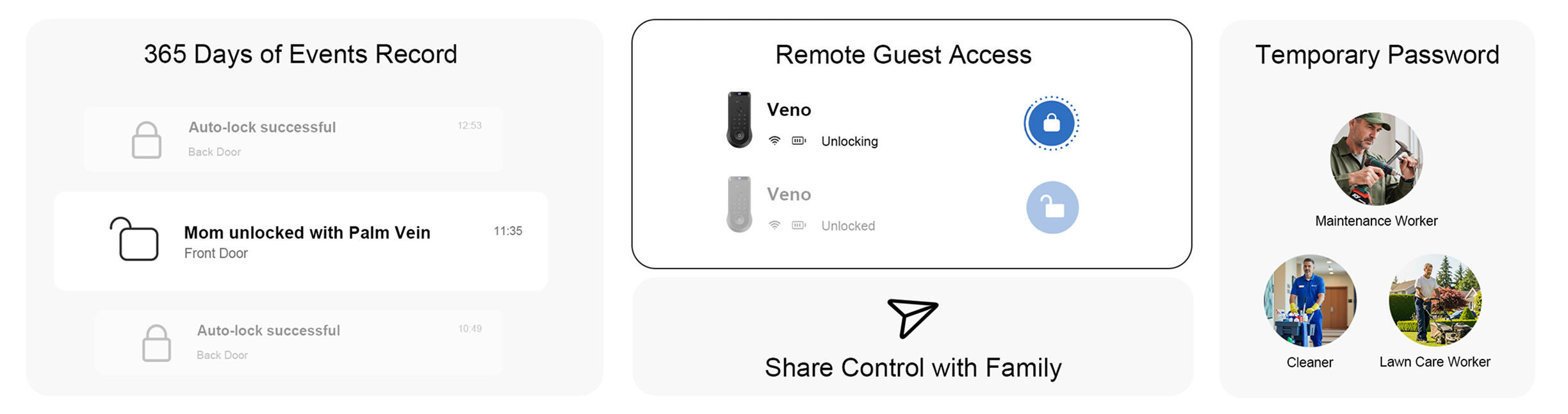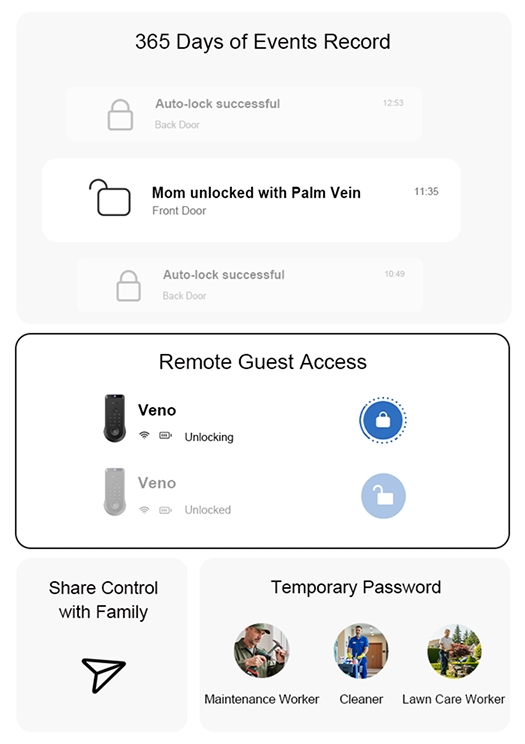 ・Venokey™ Palm Vein Recognition: Unlocks instantly—no contact, no retry. Works with wet, oily, dusty, or aging hands. Leaves no trace and protects privacy better than fingerprints.