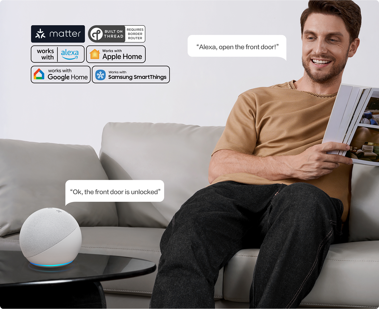 Works with Amazon Alexa, Google Home, Apple Home, and Samsung SmartThings. Control your lock with your voice.